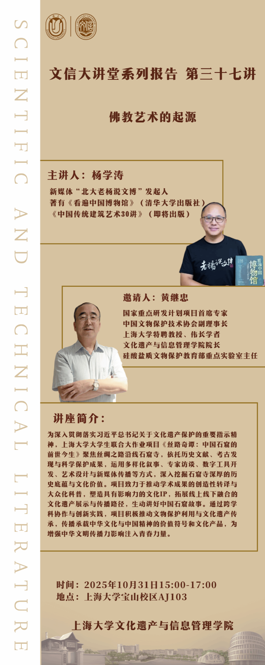 本次邀请到毕业于北京大学中文系的资深媒体人、知名文博科普创作者杨学涛,他将带来“文信大讲堂”系列主旨报告第三十七讲《佛教艺术的起源》,以典籍和出土文物为基础,系统介绍佛像、石窟、寺庙、佛塔、经幢、经变画等佛教艺术的起源及中国化进程,凸显中华文明博采众长、兼收并蓄的鲜明特色。